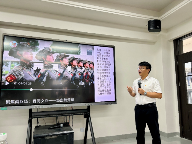陈友结合2024级海洋资源与环境专业学生先萍以女兵方阵成员身份参加阅兵仪式的事例,指出其以实际行动诠释了新时代青年的责任与担当。他号召全体同学以先萍为榜样,将爱国之情、报国之志融入日常学习生活。